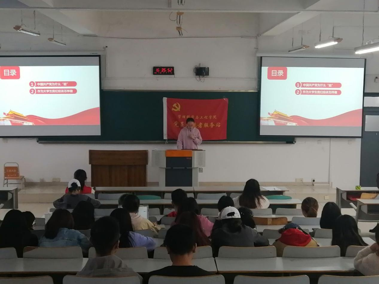 4月18日下午4:00在07408教室,“盛世华诞,党在我心——我与党合影”主题线下分享活动顺利举办,管工学院全体学生党员和入党积极分子积极踊跃参与了本次活动。活动首先进行了“听歌答题”环节,每位到会同学都积极参赛,了解每支党歌背后的厚重情怀。随后,多位同学作为主讲人为大家带来线下“我与党合影”照片分享。其中,作为预备党员的18信管一班刘银银同学从学习、工作、生活、活动四个方面为大家介绍了党史、入党流程、党组织生活及京剧《张露萍》观后感等各方面内容。京剧《张露萍》的观后感更是令同学们印象深刻,在花一样的年纪里,张露萍同志用其短短的一生演绎了对党的坚贞不渝,面对党和小我,她毅然背井离乡投奔于党的建设事业。作为新时期的党员,我们所生活的时代和革命建设初期相比无疑是更和平、更幸福的,但我们不能忘记革命先辈付出的鲜血,我们要在党的带领下,坚守初心,专心践行党的宗旨,努力建设好党的美好蓝图。作为入党积极分子的19电商二班冉昕瑜同学则着重为大家介绍了重庆工商的小红帽党建基地,该基地以社区小红帽为载体,在志愿服务中践行党全心全意为人民服务的宗旨,坚持“一件事做了三十年、三十年做了一件事”,培养学生党员、入党积极分子培养勇于担当、服务社会、甘于奉献的精神。小红帽党建基地是太阳成集团tyc539党建工作的一张名片。研究生代表杨金汇同学在与大家分享了京剧《张露萍》的同时,也提出了我们加入中国共产党的初心,初心是什么?初心是本心、本源;初心是信仰、理想;初心是信念、信心。中国共产党的初心就是为中国人民谋幸福,为中华民族谋复兴。依靠中国人民创造历史伟业,带领中国人民创造美好生活。中国共产党最大的初心就是“以人民为中心!”