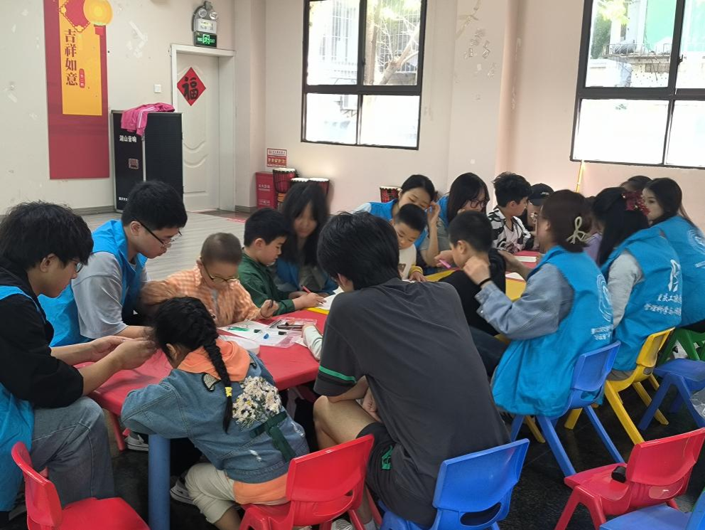 活动于下午两点开始,主持人致开场词。然后,志愿者们与小朋友一起开展了《动植物猜猜》、《听到水果请拍手》、《大泡泡和小泡泡》等游戏。每一位小朋友都积极参与到游戏中来,向志愿者们展现了独特的想象力。志愿者和小朋友的欢声笑语交织在一起,活动现场洋溢着愉快和活力。游戏结束后,志愿者们和小朋友一起合唱《猪猪侠》和《虫儿飞》等儿歌,大家跟随着节奏一起拍手,现场气氛到达了高潮。最后,小朋友和志愿者们一起绘画,充分给予小朋友们挥洒自己的创造力的空间,本次志愿活动也接近了尾声。