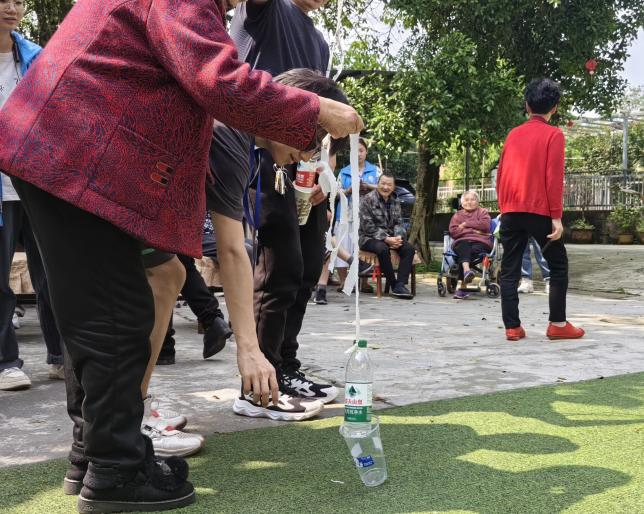 除了美妙的歌曲,志愿者们还为爷爷奶奶们精心设计了小游戏“小猫钓鱼”,老人们通过绳子手提一瓶矿泉水,将矿泉水下端放进一次性杯子里,从第一个杯子开始一直到最后一个杯子,先重叠完的老人获胜。即使是简单的游戏也带来了无穷的欢乐,志愿者们和爷爷奶奶们的脸上都洋溢着快乐的笑容。