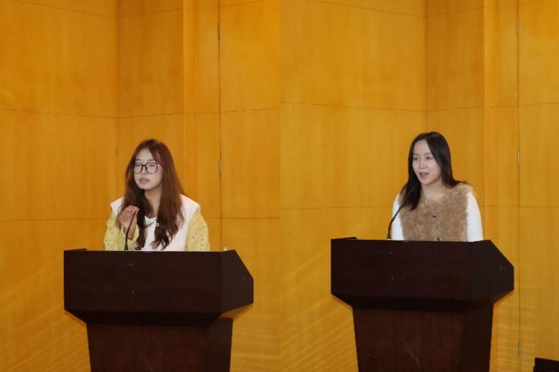 第四项议程由张双盈、吴诗雨两位上届学生会代表进行经验分享。张双盈分享了五步法给各位学生会成员,从立项到复盘,分别为“立项定标”、“方案细化”、“任务分解”、“宣传预热”、“现场执行与复盘”五步。她将自己多年的工作经验毫无保留的传授给在座的各位同学,希望他们能在往后的工作熟练运用,以尽量避免流程性错误。吴诗雨同学则是强调了制度正确与为同学服务两个方面。她希望各位学生会成员能够牢记自己的初心,全心全意为同学们服务。