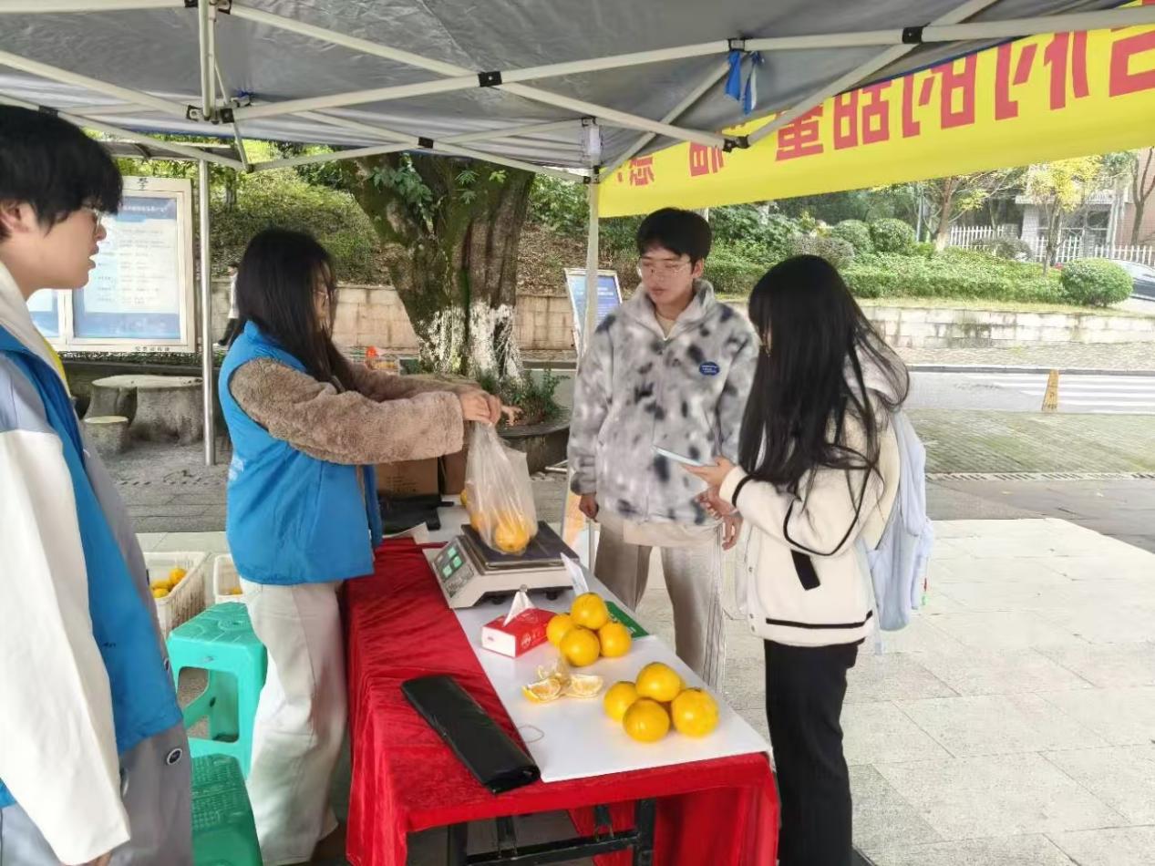 活动当天,志愿者们早早布置好摊位,将一筐筐金黄饱满的桔柚整齐摆放,并附上果农亲手写的感谢卡与种植故事。现场吸引了许多师生驻足,“这桔柚真甜!”“桔柚水分好足!”志愿者们一边热情介绍产品特点,一边讲述这些水果背后农户的辛勤劳作与乡村发展的现实需求。不少同学听完故事后,不仅自己购买,还主动与同学们分享,甚至为在家的亲人邮寄桔柚,让他们也能品尝到酸甜可口的桔柚,呼吁更多人支持。