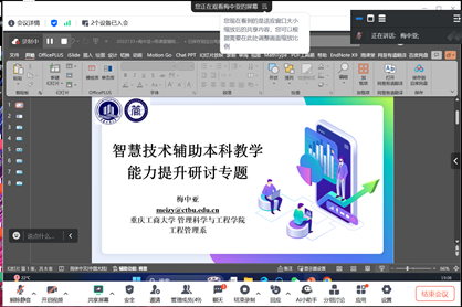 为切实做好本科教育教学审核评估,提升课堂教学质量和水平,学院在2024年10月28日晚上19:00,组织全体任课教师开展智慧教学使用手段的在线培训,培训会议由陈久梅副院长主持。学院领导班子、系主任及全体任课教师参会。