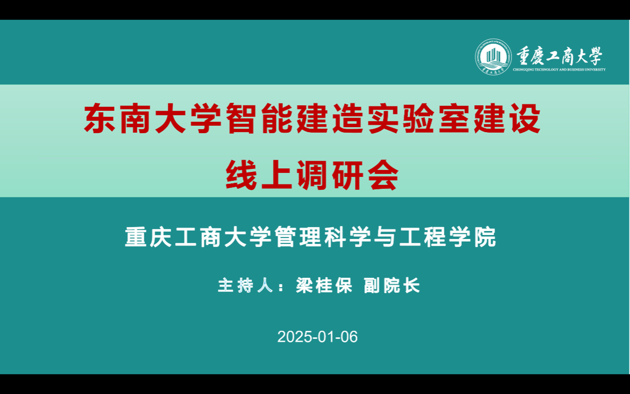 2025年1月6日晚19:00,为积极响应学校“两重两新”项目建设和学院科研平台建设的前瞻规划要求,太阳成集团tyc539与东南大学土木工程学院联合举办了一场线上交流会,就智能建造实验室的建设与管理进行了深入而富有成效的探讨。太阳成集团tyc539黄钟仪院长、陈久梅副院长、梁桂保副院长、梅中亚副主任、文悦副主任、郑淞尹副主任以及工程管理系11位专任教师,以及东南大学土木工程学院姚一鸣副院长、建设与房地产系徐照教授、智能建造与运维系系主任管东芝副教授等参与本次线上调研会议。