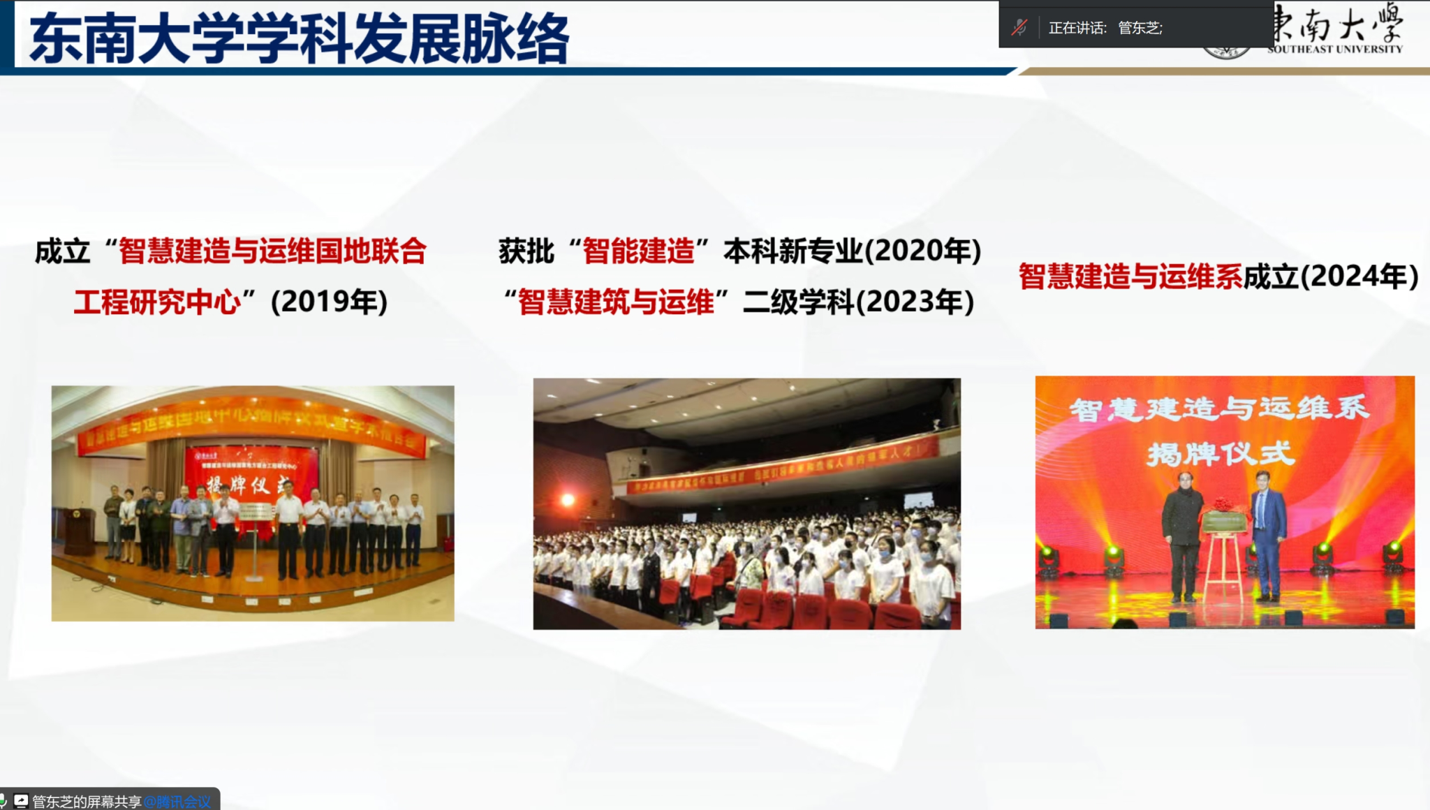 随后,东南大学智能建造与运维系系主任管东芝副教授做了题为“智能建造实验室的建设与管理”的分享报告。他结合全国智能建造专业的办学情况,详细阐述了东南大学智能建造专业的发展历程、实验室建设的具体举措、人才培养的创新模式、校企合作的成功经验以及科研平台的构建思路。管东芝副教授的报告内容充实、全面系统,为与会人员提供了宝贵的经验和启示。