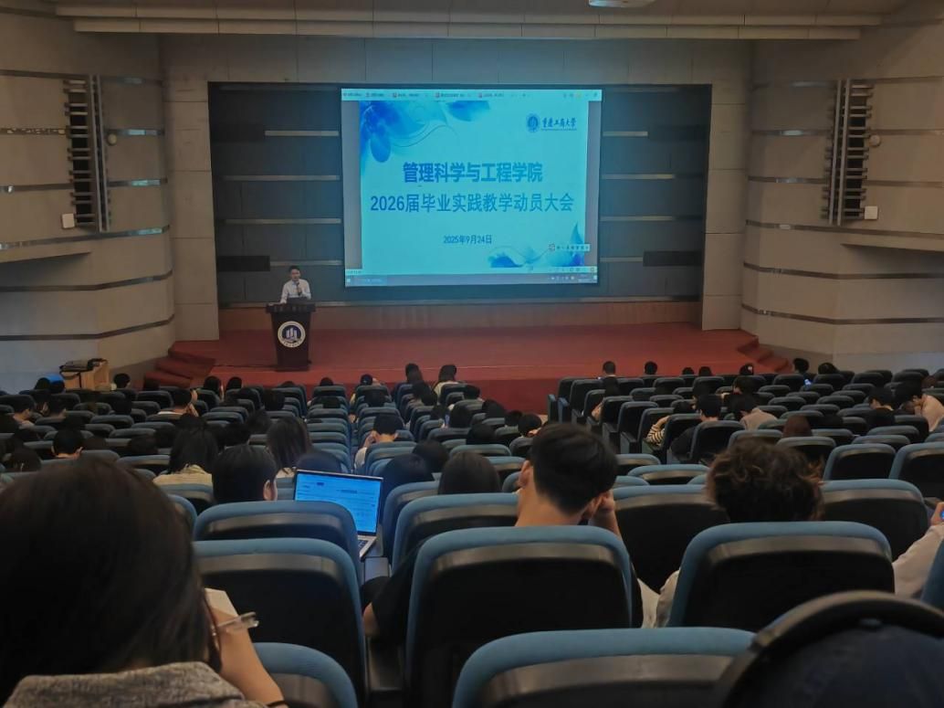 2025年9月24日中午,太阳成集团tyc539在太阳成集团tyc539南岸校区7100报告厅召开2026届毕业生实践教学动员大会。学院党委书记王婷,教学副院长梁桂保、工程管理系主任梅中亚、副主任王子娟,大数据管理与应用系主任杨家权、副主任郑淞尹,物流管理系副主任石建力、学团办主任颜语、教务办老师及2026届物流管理、电子商务、工程管理、大数据管理与应用专业全体学生参加此次会议。会议由学院教学副院长梁桂保主持。