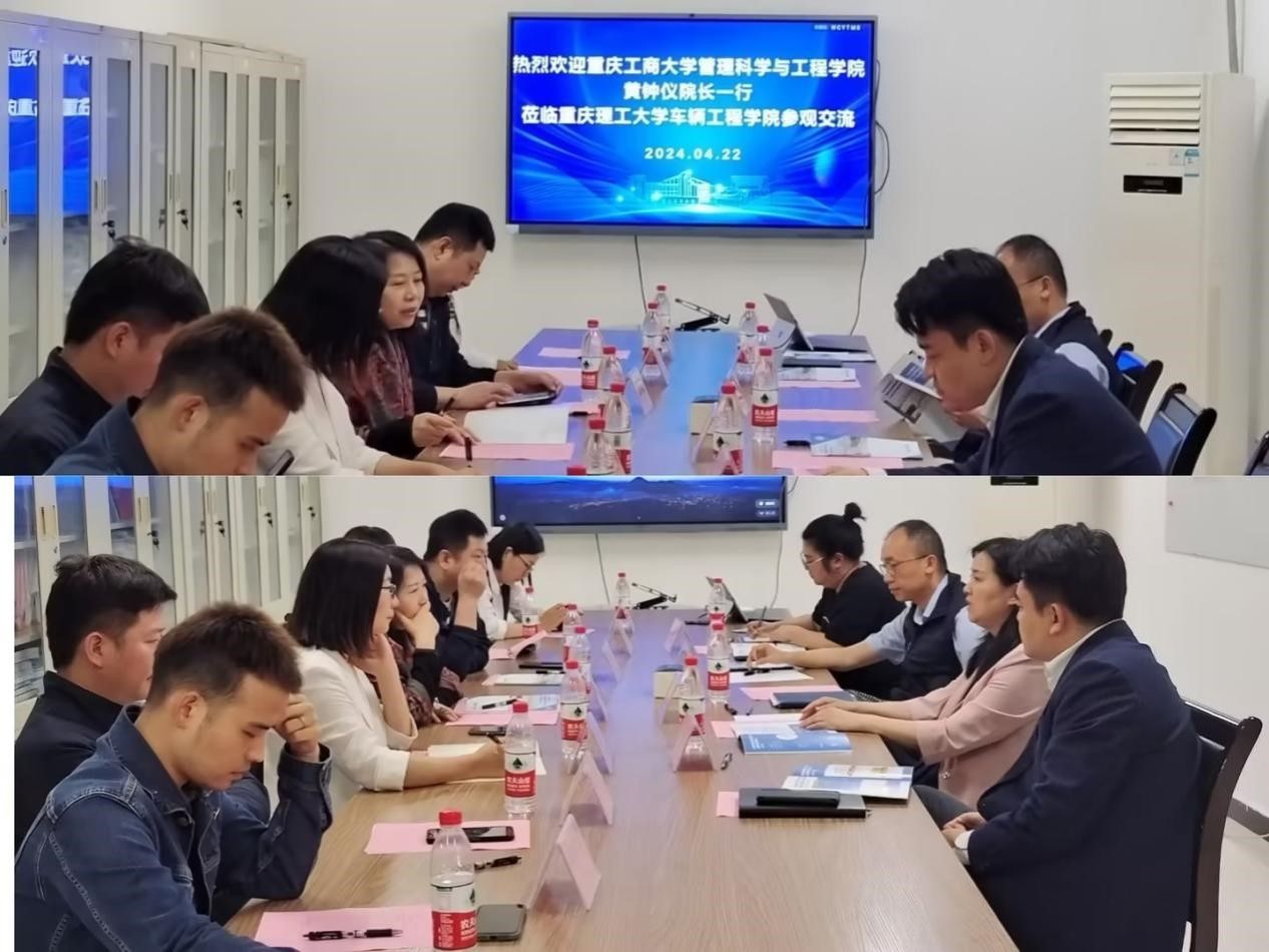 2024年4月22日上午,为进一步推进现代产业学院建设和发展,深度推进产教融合,学院院长黄钟仪、副院长陈久梅、副院长詹川,物流管理系主任龚英、电子商务系主任唐国锋、大数据管理与应用系主任邢文婷、工程管理系副主任梅中亚一行赴重庆理工大学新能源汽车现代产业学院,与车辆工程学院党委书记俞宁、副院长蒋成约、副院长郭栋、新能源汽车现代产业学院建设办公室负责人宋洁进行了交流。