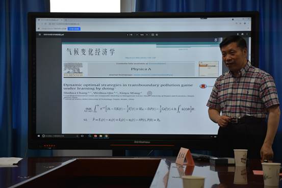 詹院长首先向大家介绍了张书华教授学术背景以及其在偏微分方程高精度算法及金融衍生品定价方面的丰硕成就。随后,张教授为大家讲授了气候变化经济学、金融工程与管理的相关知识,并详细讲解了他们团队关于“以量子力学为基础,耦合非线性微分方程,预估2030年碳排放将达到高峰” 的研究成果。报告完后,胡森森和解婷等老师和张教授如何“兼顾模型复杂度和数据处理”、“建模模型的选择”等问题展开了深入的交流,现场学术气氛活跃,师生们纷纷提问交流。