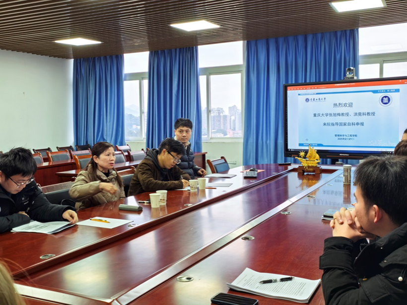 2025年2月21日上午,学院领导邀请重庆大学经济与工商管理学院张旭梅教授、重庆大学管理科学与房地产学院洪竞科教授来院指导国家自然科学基金项目申报,学院院长黄钟仪教授、副院长陈久梅教授与申报老师参加。