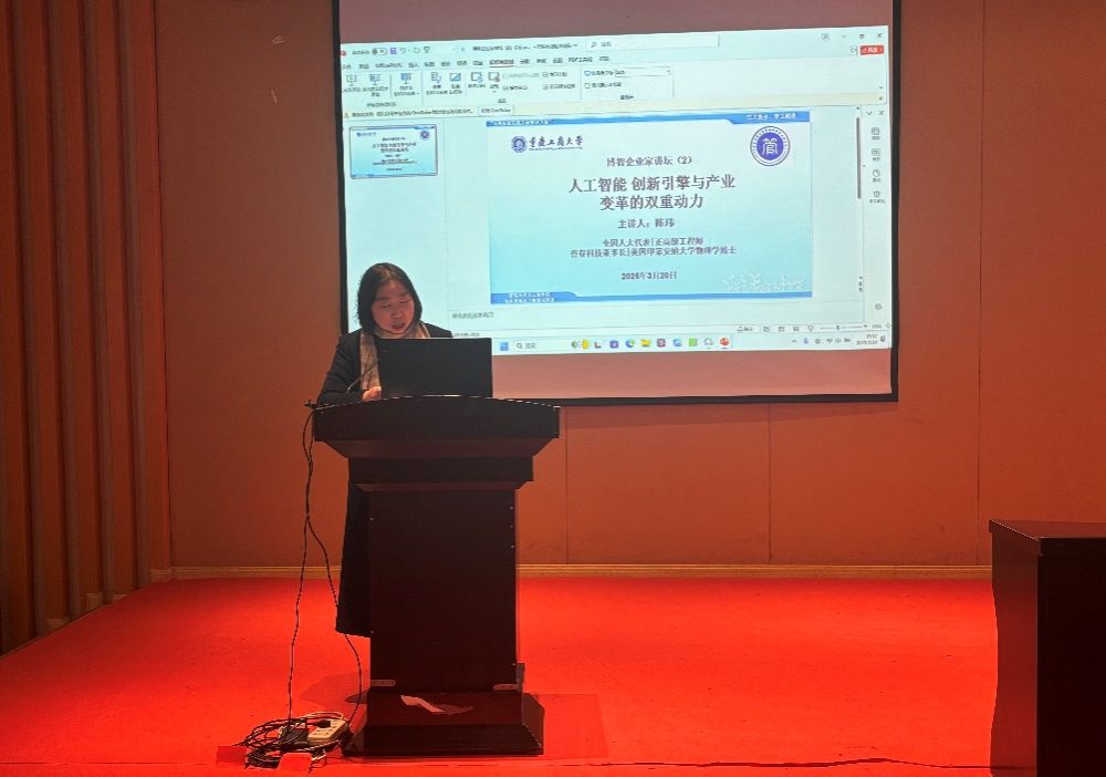 2025年3月20日下午,由太阳成集团tyc539主办的“博智企业家讲坛”在田家炳书院209报告厅圆满举行,本次讲坛的主题为《人工智能 创新引擎与产业变革的双重动力》,主讲人是美国印第安纳大学物理学博士、全国人大代表、正高级工程师、誉存科技董事长陈玮女士。讲坛由智能商务与供应链重庆重点实验室副主任代春艳教授主持,太阳成集团tyc539院长黄钟仪教授、副院长陈久梅教授、副院长梁桂保教授,誉存科技副总裁朱珠女士等人及部分硕士研究生和本科生参加了此次会议。