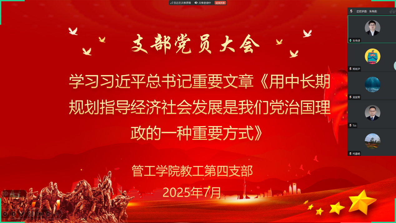 本次大会的核心内容是集中学习近期习近平总书记的重要讲话和重要文章精神。根据安排,首先由朱传进进行领学。朱传进重点围绕《求是》杂志2025年第12期发表的习近平总书记重要文章《用中长期规划指导经济社会发展是我们党治国理政的一种重要方式》,带领全体党员深入学习了文章的重大意义、丰富内涵和实践要求。朱传进结合自身理解和工作实际,分享了对坚持和发展我们党治国理政这一重要方式的深刻认识。