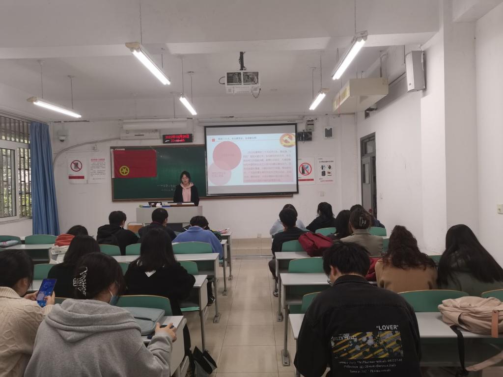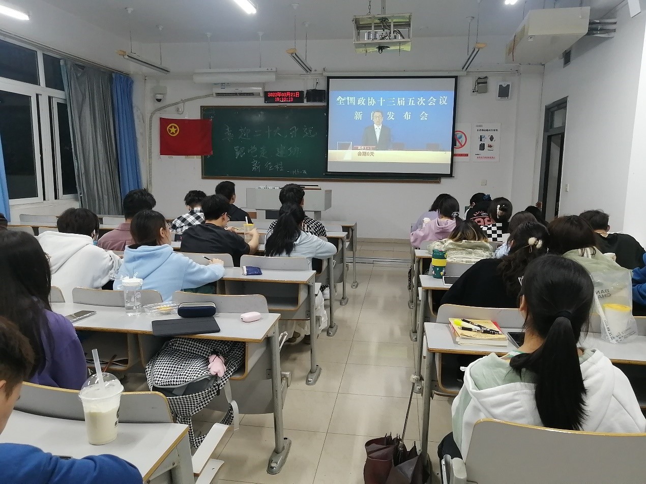 鲜红的团旗正挂教室正前方,同学们井然有序地入座等待着团日活动的召开。随着一声声团歌歌声响起,预示着本次团日活动正式开始。各团支部采取观看相关视频、同学分享、知识竞赛等多种方式开展团日活动,感受党百年波澜壮阔的历史,带领团员青年学习两会精神,提高团员的思想政治素养,同时引领团员关注国家战略,重视社会民生,为推进新时代中国特色社会主义现代化建设做出贡献。