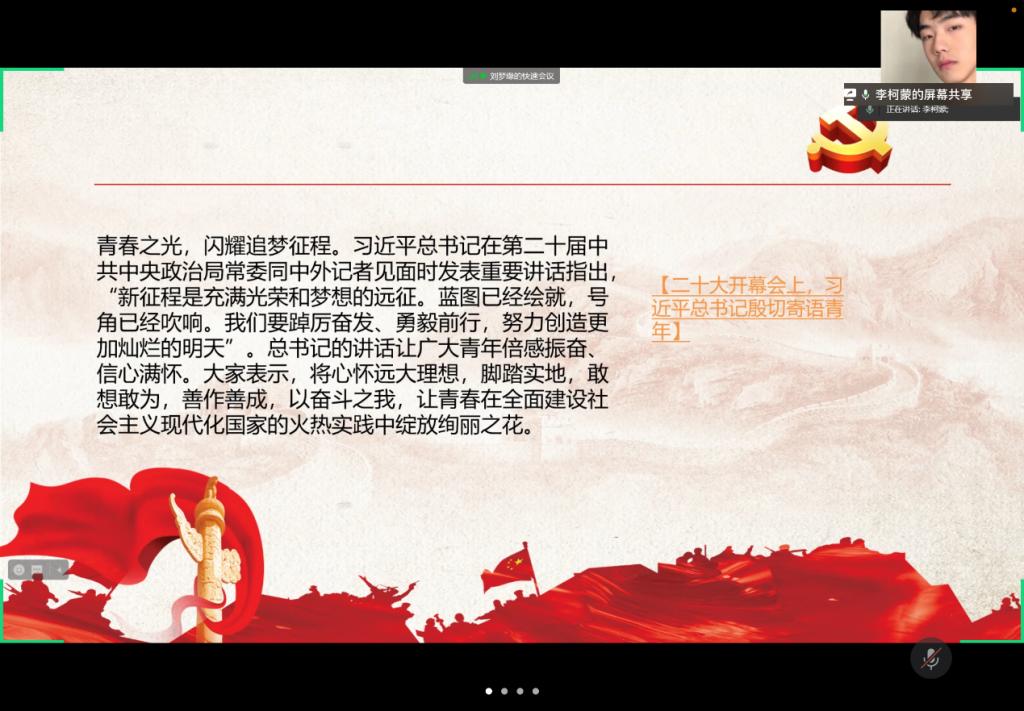 各团支部以领学、宣讲、学习心得分享、党史问答、红歌竞猜,“青听青诉-中国故事”分享等多种形式推进青年深入理解党的二十大精神,推进青年更加深刻领悟“两个确立”的决定性意义,更加紧密地团结在以习近平同志为核心的党中央周围,不断增强“四个意识”、坚定“四个自信”、做到“两个维护”,将党的二十大精神扎实贯彻落实到学习工作中,以更加开放的思路和胸襟,研究新情况、解决新问题、推动新发展,做担当民族复兴大任的时代新人。