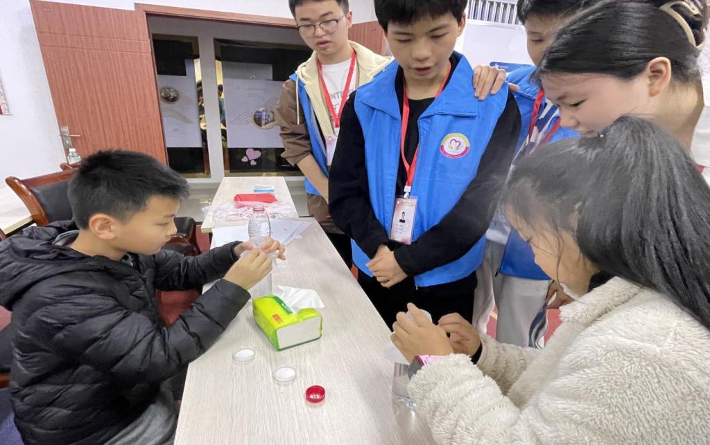 活动第一项,志愿者对小朋友的课程作业进行辅导,这个环节不仅帮助孩子们减轻了课业压力,培养了良好的学习思维,也更好地帮助了他们找到正确的学习方式。接着开始活动第二项,志愿者带着孩子们动手做实验,先由志愿者们进行示范操作,随后让孩子们自己动手体验,以培养孩子们的科学思维,激发青少年对知识的求知欲,锻炼他们学习、思考、实践的能力。志愿者与小朋友们在整个活动过程中相处的十分融洽且在活动的尾声进行了合照以留作纪念,在欢声笑语中活动就此告一段落。