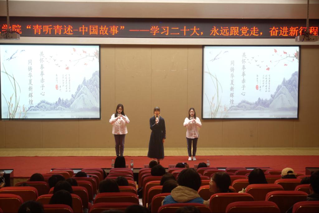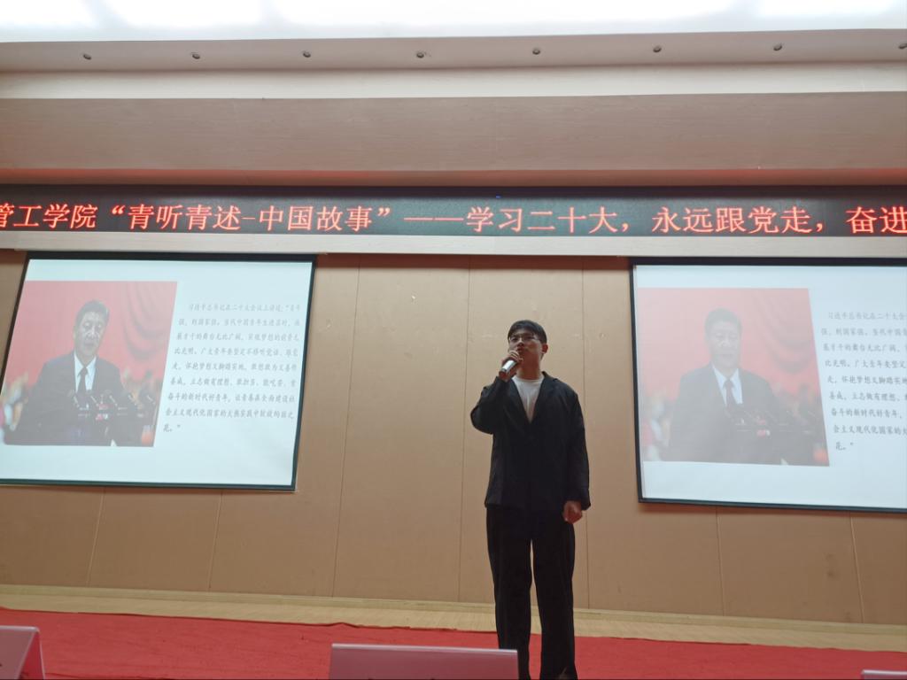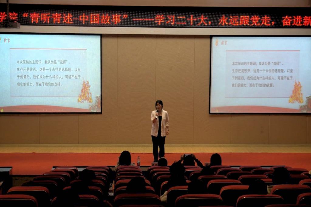 本次活动通过层层选拔,最终8位选手进入决赛。同学们通过演讲、朗诵、情景剧等形式分享了一个个感人至深的励志故事。《临危不惧上一线,志愿救火勇担当》讲述的是学院退伍军人大学生宋文蛟,在接到指令后第一时间奔赴重庆山火一线参与志愿救火,践行自己“大”字人生的事迹;《共怀拳拳赤子心,同铸华夏新辉煌》融入了手语表演为现场观众展现了自幼失聪的清华博士—江梦南生活的一隅,生活以痛待她,而她却选择成为了无声世界里的逐梦赤子;芳华虽短,馨香永存的村干部黄文秀、为奉献者奉献,与逆行者同行的张超凡、在疫情大考下抒写别样年华的甘如意、从渴望读书的大眼睛到今天二十大代表的苏明娟、致力于做好农村电商搭桥人的小云雀……