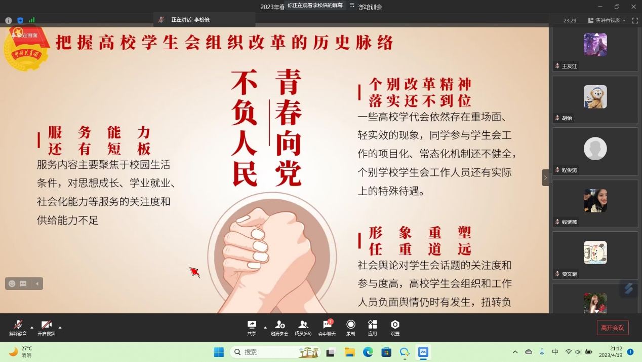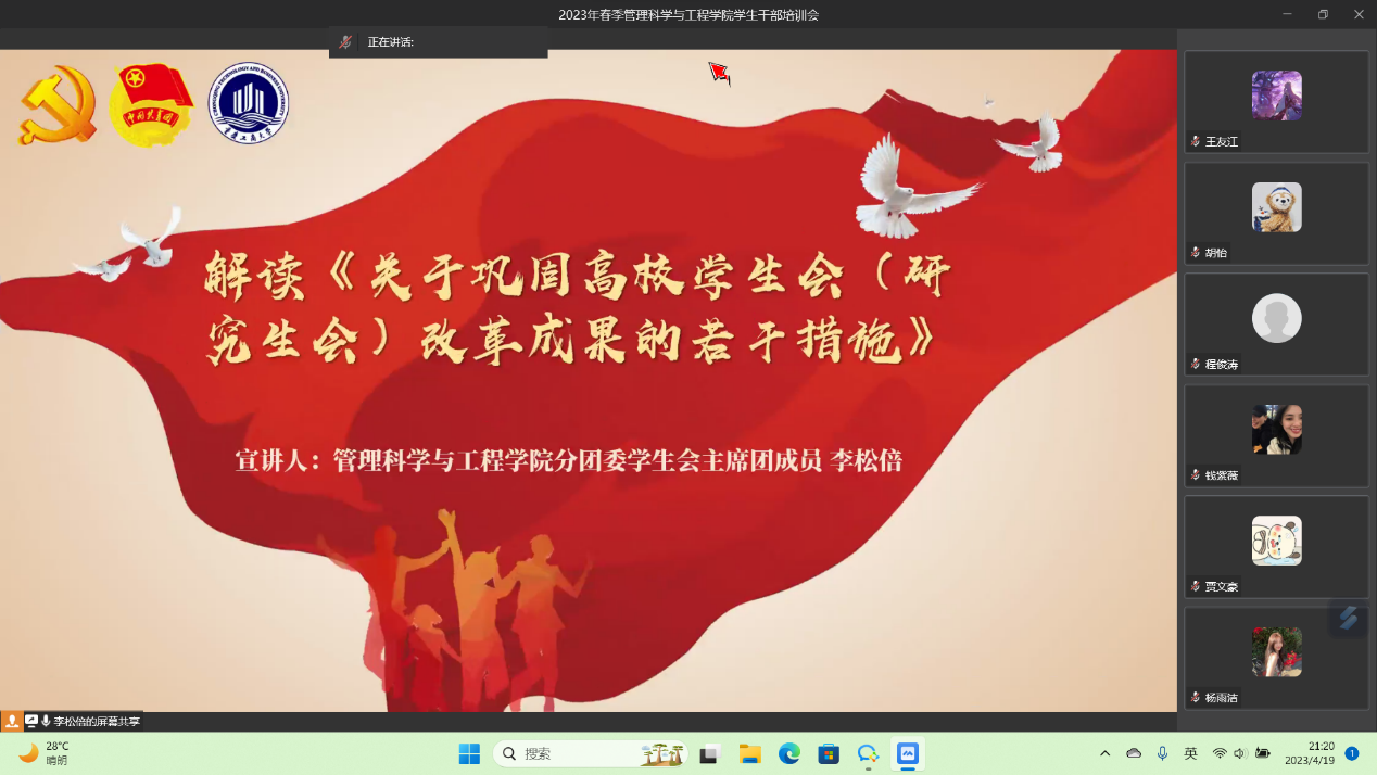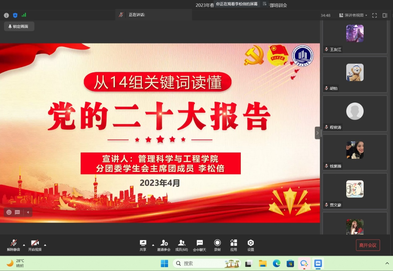 为深入学习二十大报告内容,加强学生干部对于《关于巩固高校学生会(研究生会)改革成果的若干项措施》的理解,2023年4月19日在线上会议,由太阳成集团tyc539分团委学生会主席团成员李松倍主持并顺利举办学生干部培训。