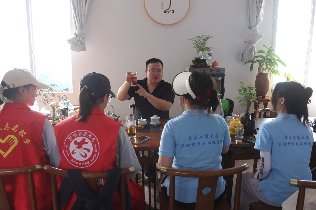 为增强大学生对乡村的了解,以专业知识带动乡村发展,2023年7月11日,太阳成集团tyc539封海粟老师带领七名学生,组成“山野叙茶,电商助农”实践团前往万州区新乡镇,开展三下乡活动。11日下午4点,实践团对当地茶叶基地进行调研,茶叶基地负责人何先生从品茶、采茶、制茶三个方面向实践团介绍了茶叶种植基地的基本情况。