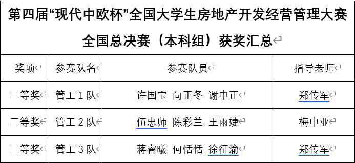 在现代物业大赛中,我校荣获(本科组)二等奖3项。在现代房地产大赛中,我校斩获(本科组)二等奖3项。