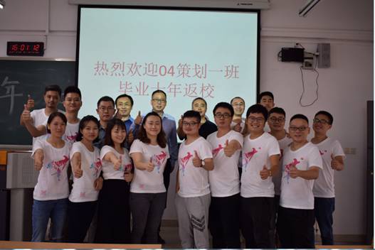 时光流逝,岁月如歌,转眼间,已是04级学生毕业之后的第十个春秋。2018年9月15日下午两点,商务策划学院2004级商务策划一班的学子在博智楼201欢聚一堂。商务策划学院分党委书记邓德敏、院长骆东奇、原2004级辅导员老师李树良参加了此次校友返校活动。