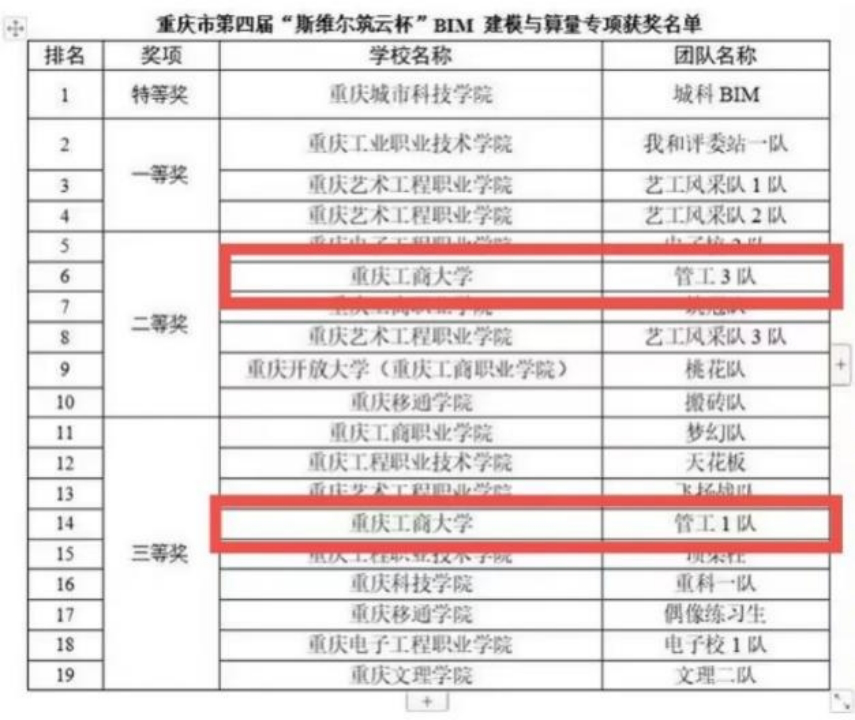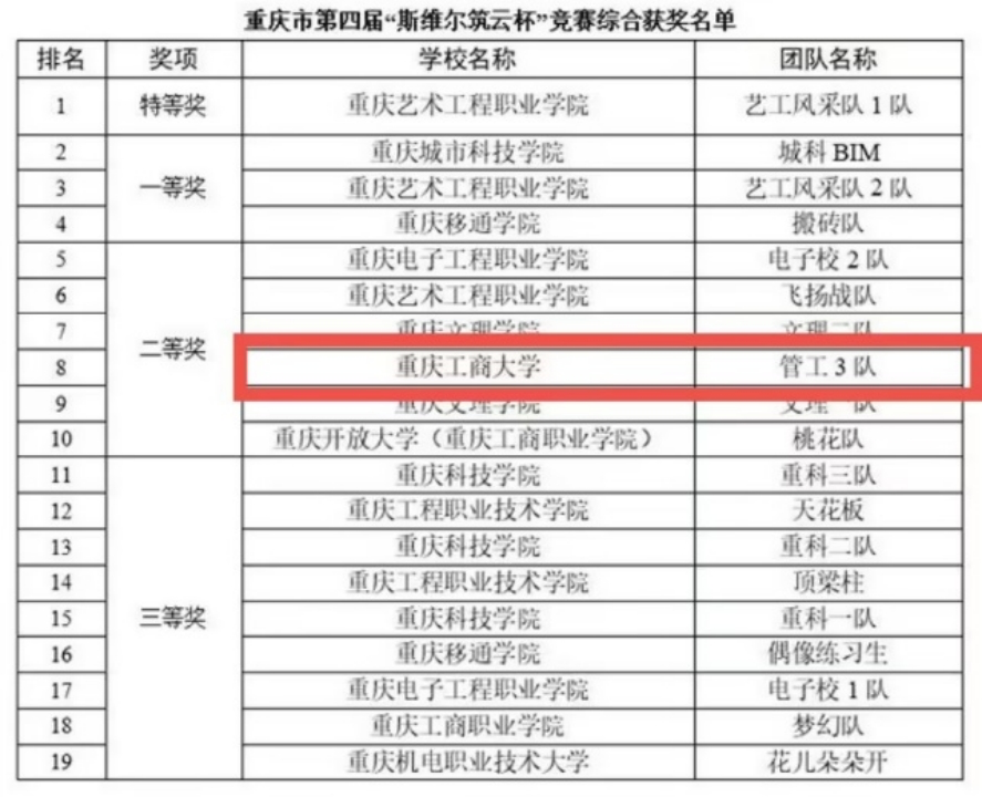 2023年4月8日,由重庆市土木建筑学会主办、重庆艺术工程职业学院承办,深圳市斯维尔科技股份有限公司和重庆市筑云科技有限责任公司协办的重庆市第四届“斯维尔筑云杯”高等院校学生BIM技术应用技能竞赛在重庆艺术工程职业学院圆满完成。本次比赛以团队方式进行,各团队成员进行现场答题,合作完成各科目题目。我校工程管理专业学生在此次比赛中共获得了三个奖项,分别是单项二等奖、三等奖、团队二等奖和优秀指导老师奖。