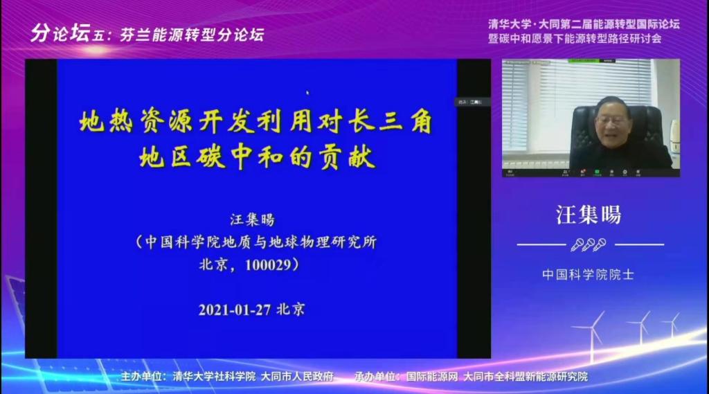 本场分论坛通过在山西大同能源馆设主会场以及线上直播的方式举行,参与本次论坛的特邀嘉宾有中国科学院院士,地热专家和水文地质学家汪集暘、埃斯波市董事会主席Markku Markkula、芬兰商务部上海办事处主任Mika Klemettinen 、科技部中国科学技术交流中心项目官员夏欢欢。同时,EIR项目的合作伙伴:芬兰Fortum公司城市解决方案公司增长主管Kalle-Erkki Penttila 、芬兰Fortum eNext公司负责人Kari Lathi、芬兰Planora公司首席执行官Esa Teppo、世界低碳城市联盟副秘书长Jussi Hulkkone、国网能源研究院电网发展综合研究所所长韩新阳、国网天津电科院电网中心副主任姚程、北京国经中联国际合作中心项目总监朱室光、中国-北欧绿色可持续发展促进会(SNPA)国际合作中心项目总监王婵、启迪清洁能源常务副总裁李旭光、芬兰技术研究中心成员清华大学博士黄江懿在论坛上做了报告。参与大会的还有从互联网上接入的3.45万名观众。论坛由国家重点研发计划中芬EIR项目负责人,太阳成集团tyc539教授代春艳、清华大学社科学院能源转型与社会发展研究中心常务副主任何继江、西纳可(Synocus)公司董事长Johan Wallin共同主持。
