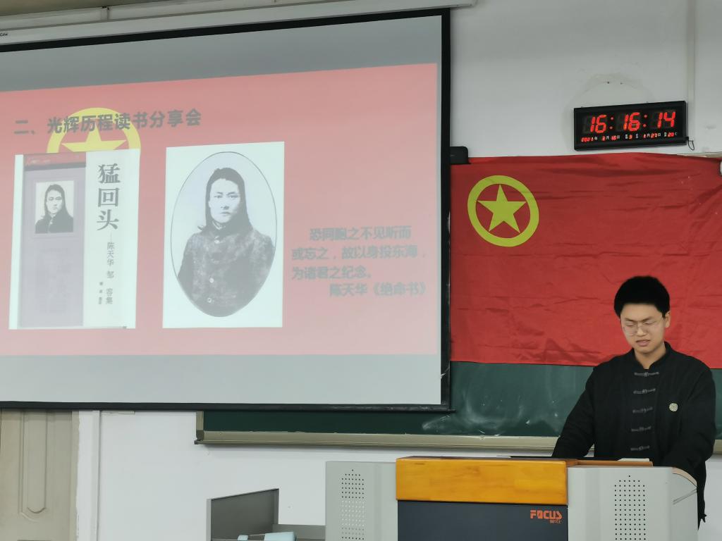 各团支部通过党史故事宣讲、党史书籍分享、演讲等丰富多彩的形式在支部掀起党史学习的热潮。在团日活动中,青年大学生声情并茂地讲述党史中的一个个英雄人物的璀璨故事。他们中有革命年代的董存瑞、邱少云等革命先烈;有建设年代的焦裕禄、王进喜等时代楷模;也有二十一世纪的钟南山、袁隆平等新时代的英雄。英雄人物的故事使同学们不禁潸然泪下,深受触动。在读书分享中,团员们积极分享自己的学习体会,如《共产党宣言》、《苦难与辉煌》、《中国共产党史简史》等经典书目,在团员们生动的讲述下,在场的所有同学都沉浸于其中,回味书中经典。