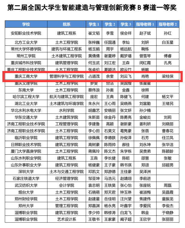 我校工程管理专业2018级占道茂同学、刘云飞同学和2019级余奎同学在此次大赛中充分体现出团队协作能力,取得了优异成绩。荣获团体一等奖,成功入围决赛。