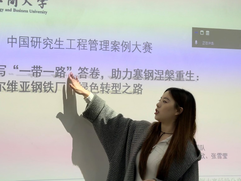 在专题分享环节,获奖团队三位代表依次分享了参赛经验,为课程提供了鲜活的实战案例与方法指导。刘瑞瑶同学以“书写‘一带一路’答卷,助力赛钢涅槃重生——塞尔维亚钢铁厂绿色转型之路”为例,深入解析了案例选题策略与命题优化技巧,展示了如何将时代议题有效融入工程管理案例构建,提升了同学们对选题方向与现实结合点的把握能力。张雪莹同学则聚焦于作品结构搭建与核心内容撰写,从逻辑结构、分析框架到文字表达,系统梳理了高质量竞赛作品的构建路径,增强了学生在案例写作过程中的条理性与表达力。胡欣同学围绕多媒体呈现,介绍了视频制作的流程与实用技术,并结合自身参赛作品的复盘经验,提出具体优化建议,拓展了课堂教学在成果呈现与表达形式上的应用空间。