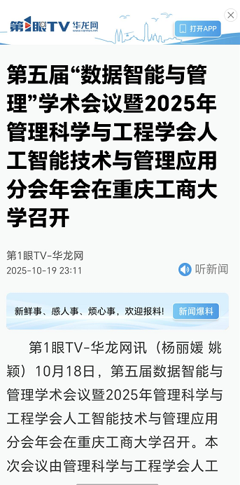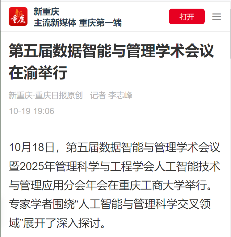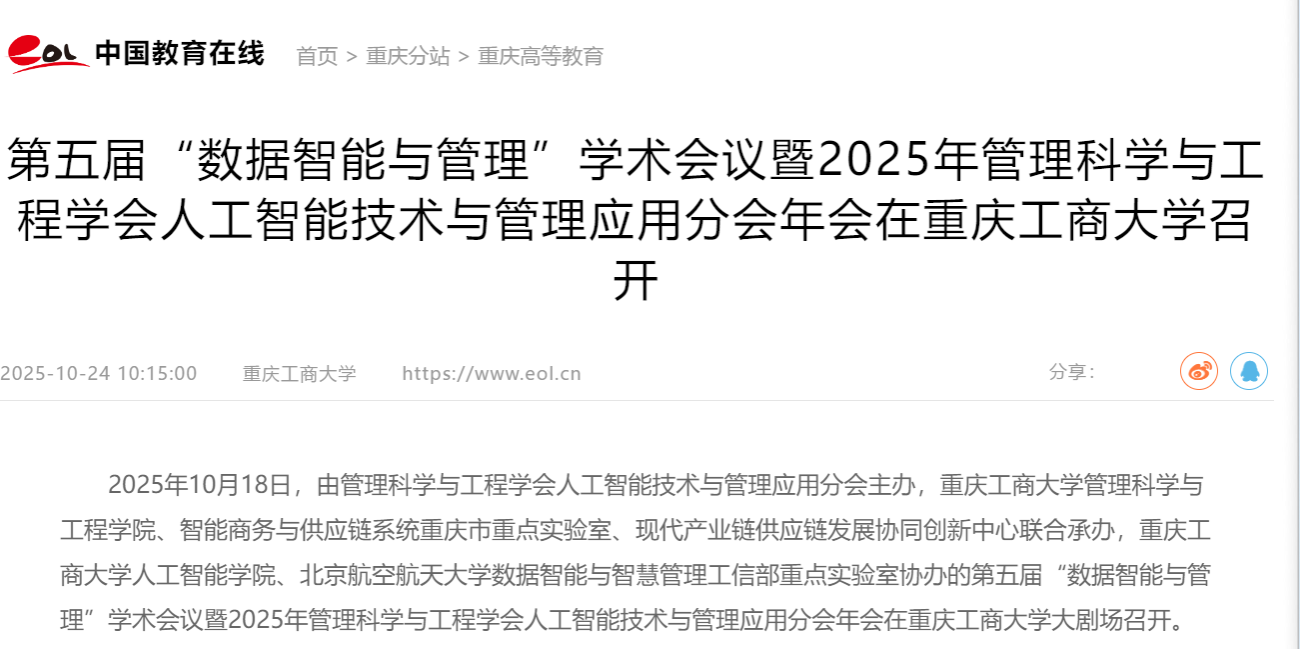 新重庆-重庆日报以《第五届数据智能与管理学术会议在渝举行》为题,中国教育在线以《“第五届“数据智能与管理”学术会议暨2025年管理科学与工程学会人工智能技术与管理应用分会年会在太阳成集团tyc539召开》为题,华龙网以《第五届“数据智能与管理”学术会议暨2025年管理科学与工程学会人工智能技术与管理应用分会年会在太阳成集团tyc539召开》为题纷纷报道了本次活动。
