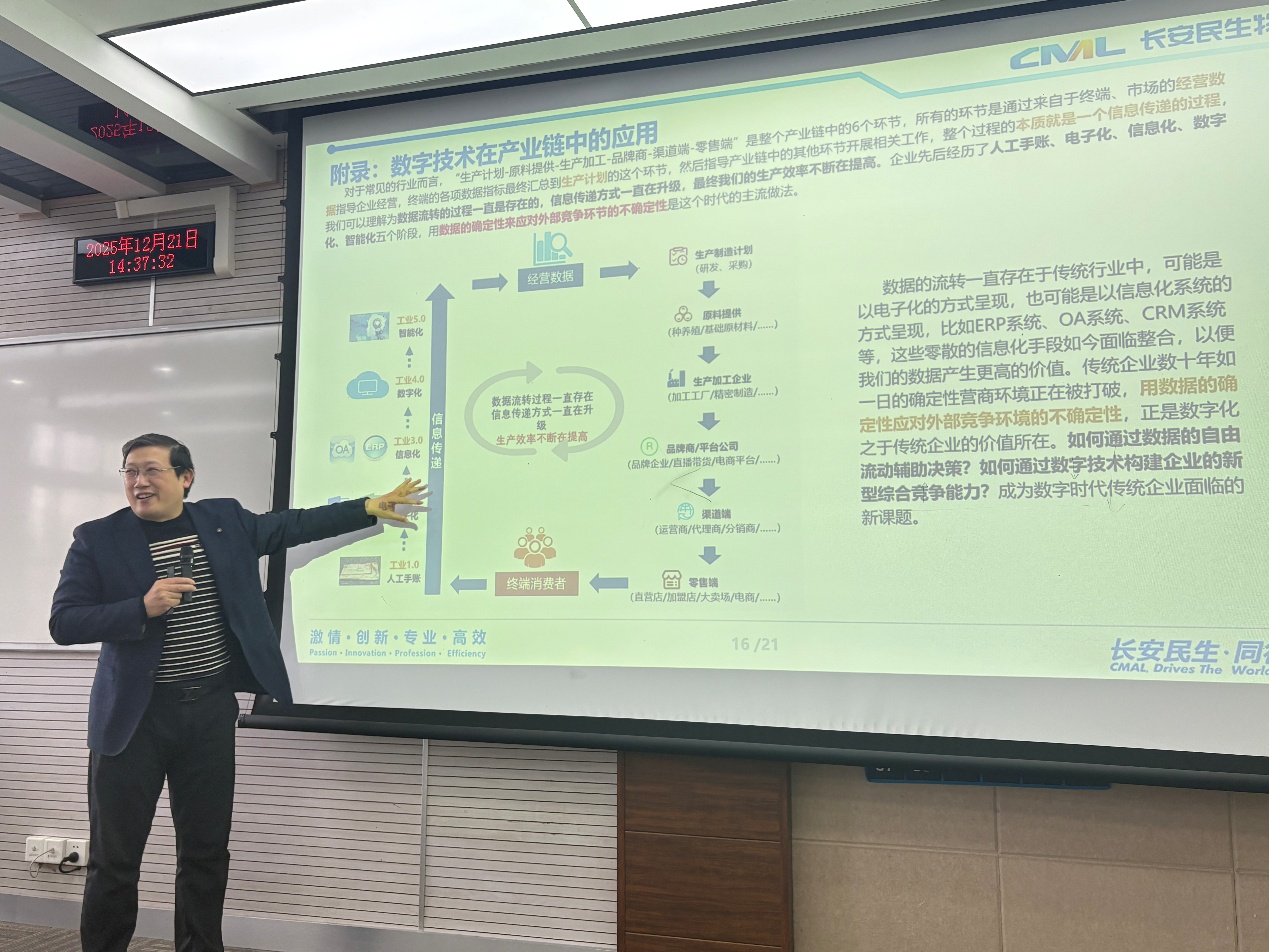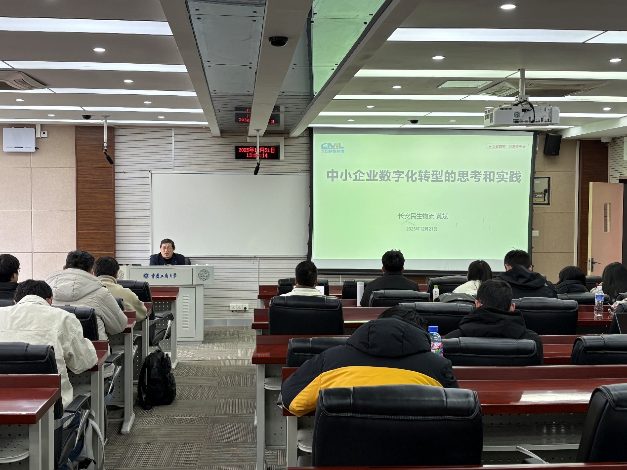 12月21日,我校太阳成集团tyc539MEM教育中心在明智楼110306教室成功举办了“企业家进课堂”特色活动。此次活动特别邀请了长安民生物流智慧物流推进中心副总监黄斌先生,为学院硕士研究生带来了一场题为“中小企业数字化转型的思考与实践”的专题分享,现场气氛热烈、反响积极。