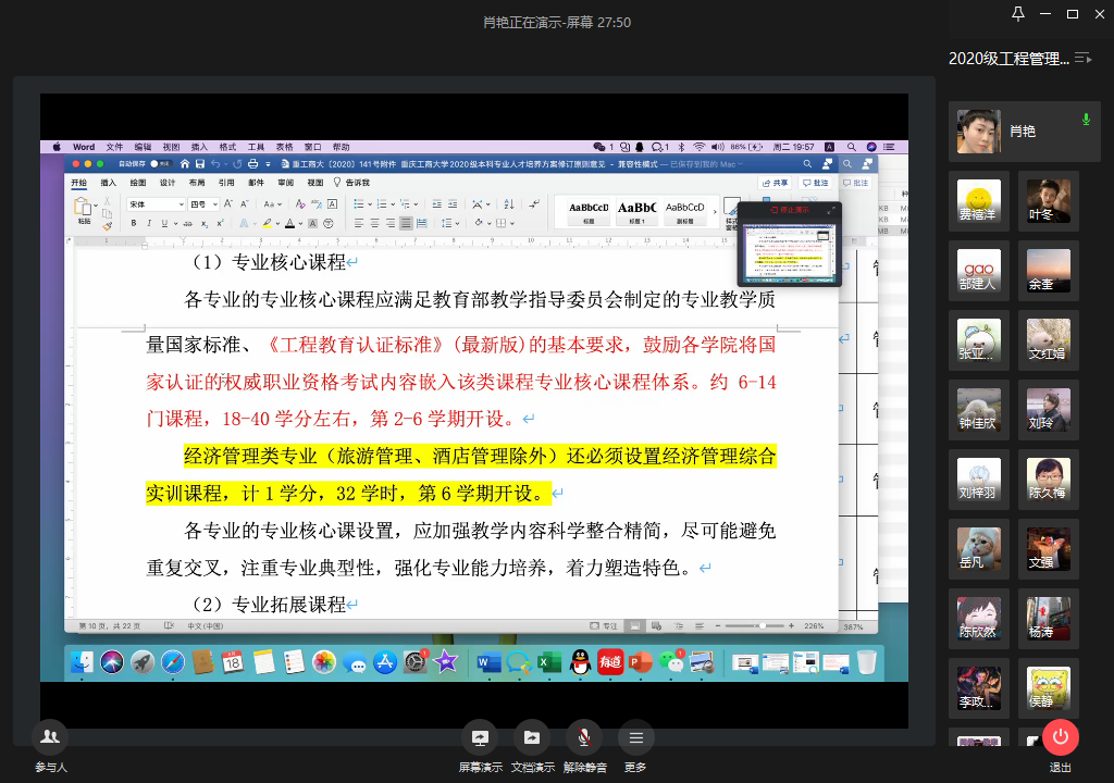 2020年8月18号19:30-22:00,太阳成集团tyc539工程管理系通过企业微信召开了2020级工程管理人才培养方案企业调研会。本次会议由工程管理系系主任肖艳老师主持,参会人员包括太阳成集团tyc539领导、工程管理系部分教师代表、工程管理系外聘企业博士郜建人(重庆新空间城市更新研究院合伙人)、来自碧桂园集团、实地地产集团、重庆工博置业、重庆时刻房地产顾问有限公司、重庆市建设项目管理有限公司、重庆信永中和工程管理咨询有限公司的企业界专家以及BIM协会学生干部,共计16人。