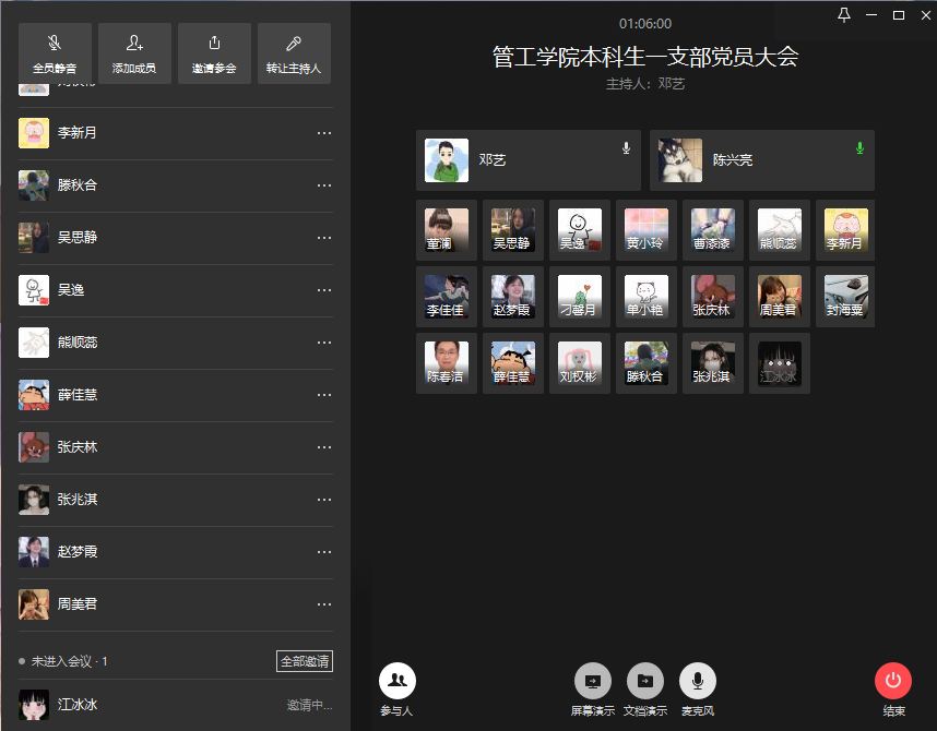 在会议线上交流中,学院分党委陈春洁副书记同支部党员学生深入交流,并嘱咐党员学子:全院本科生1255人,学生党员不足40人。各位都是学院学生中最优秀的分子。请大家时刻牢记身份角色,在学习生活各方面良好发挥模范带头作用,因为你什么样,你身边人就认为共产党什么样!