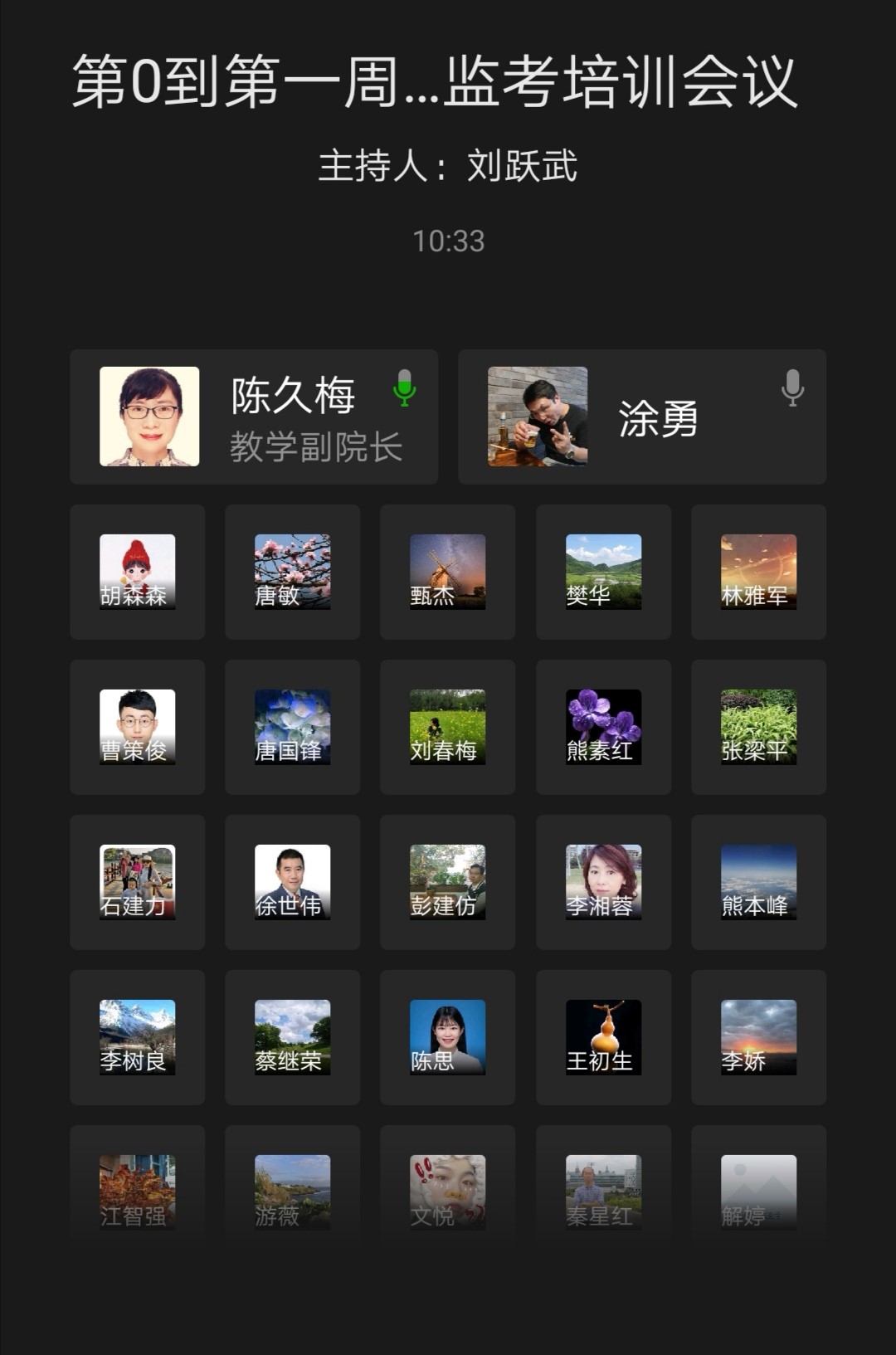 为第0、1周考试顺利进行,8月29日21:00—22:00,管理科学工程学院通过企业微信召开了全院教师考试工作培训和布置会议。教学副院长陈久梅、教务办老师刘跃武、肖国萍,管理管理与工程学院四个系辅导员、监考教师、任课教师,课程归属为原商务策划学院的来自工商管理学院的监考教师、任课教师参加了会议,会议由教学办主任刘跃武主持。