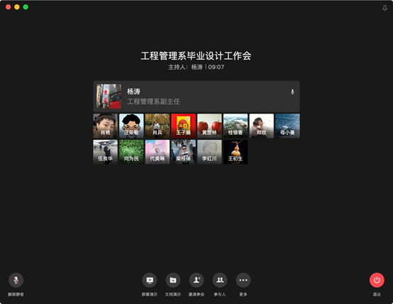 为落实2017级学生毕业设计工作安排,助力17级学生毕业实践工作顺利开展,太阳成集团tyc539工程管理系于10月18日晚上7点在企业微信召开了毕业设计在线工作会。会议由工程管理系主任肖艳、系副主任杨涛主持,工程管理系共计16位教师参加了本次会议。