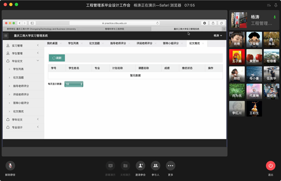 接下来肖艳老师对杨涛老师讲解进行了总结和补充说明,指出了该实践系统全程实现无纸化,避免签字繁琐工作等优点;同时提醒老师们注意系统的时间节点、论文设计各环节顺序以及对老师指导次数的要求。