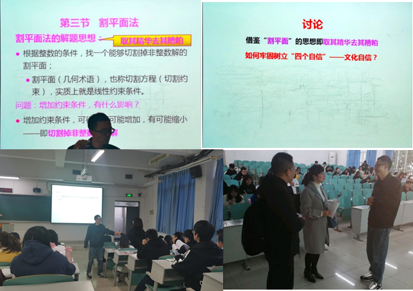 课程开始,饶扬德老师复习完上次课“分支定界法”后,讲述求整数线性规划最优解的“割平面”方法时,特别提出其解题思想——取其精华去其糟粕。即去掉没有用的非整数部分即“糟粕”,保留(汲取)有用的整数部分即“精华”。基于此,饶教授认为,在扩大改革开放发展我国国民经济进程中,要积极汲取有利于经济发展的正能量的“精华”,踢出不利于发展国民经济的负能量的“糟粕”。在借助于例题讲完用“割平面”方法求解整数线性规划最优解之后,提出讨论题即:借鉴“割平面”的思想即取其精华去其糟粕,如何牢固树立“四个自信”。同学们积极讨论并进行了具有正能量的回答。认为,努力发掘古今中外各种文化的精华,让一切有利于发展我国国民经济的东西即“精华”为我所用,剔除掉不利于现代化建设的东西即“糟粕”……。