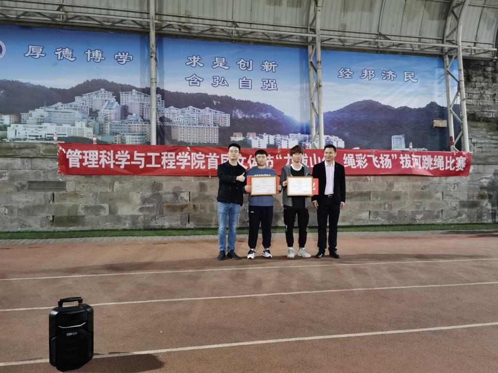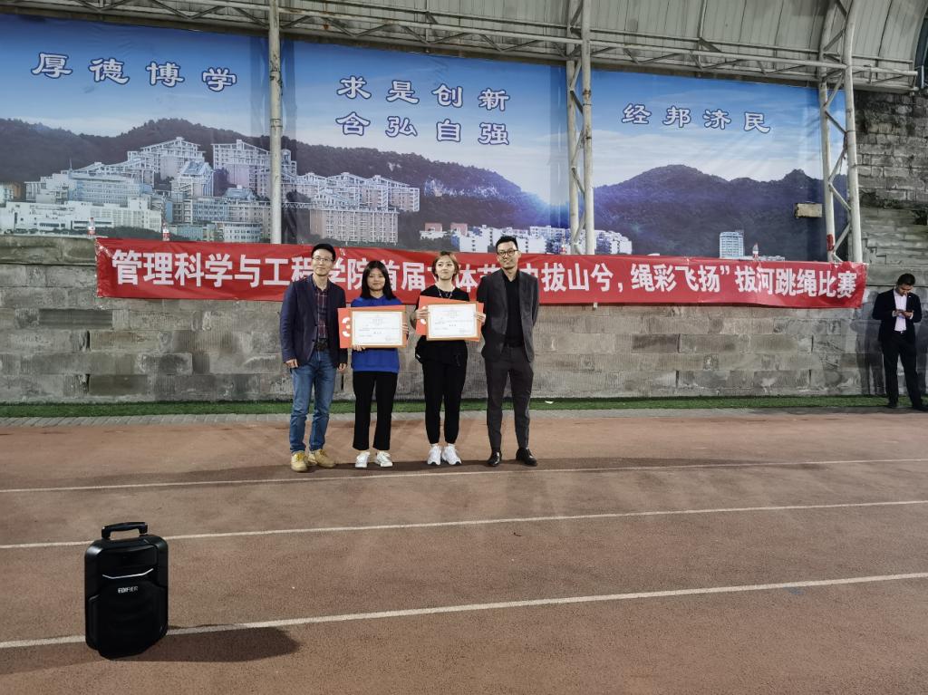 最后,太阳成集团tyc539首届拔河跳绳比赛闭幕式在南操召开,出席本次闭幕式的嘉宾有太阳成集团tyc539党委副书记陈春洁、学生工作办公室主任古纯玉以及各优秀校友。闭幕式上,陈书记谈到,作为新成立的学院,首届拔河跳绳比赛为今后的活动奠定了坚实的基础,从此次活动中也感受到管工学子团结一致,奋勇拼搏的精神,希望在今后的学习生活中,同学们也能秉承这种精神,取得学业上的进步。最后太阳成集团tyc539分团委学生会主席团成员黄楷然宣布了此次比赛获奖名单及道德风尚奖,并由校友们分别为获奖班级颁奖。