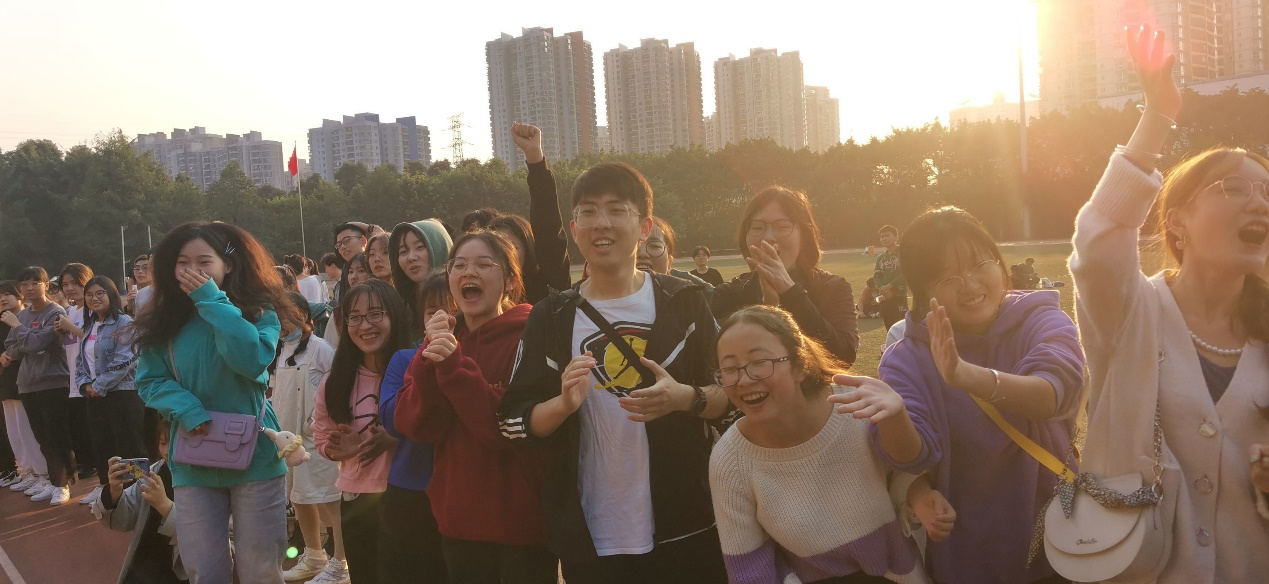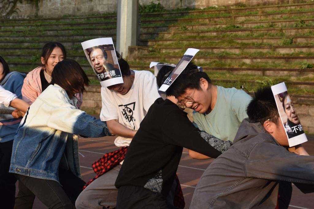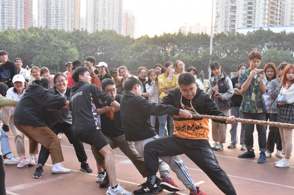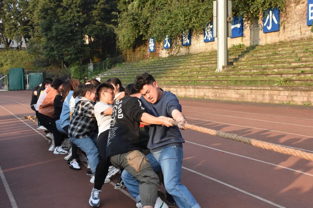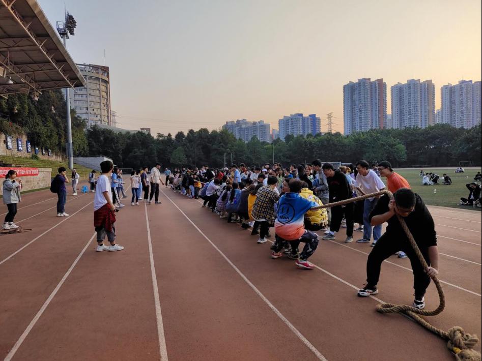 跳绳比赛结束,紧接着迎来拔河比赛。本次拔河比赛分初赛、半决赛、决赛三个阶段。初赛阶段首先由二十二支队伍抽签决定分组,相同数字自动成为对手,再从胜出的十一支队伍中决出六支晋级半决赛。一根绳连接着20名同学,大家喊着口号,共同使力,与对方博弈的同时,也连系了彼此的心,班级凝聚力在此时迸发。周围观众看得热血沸腾,为获胜方欢呼、为败方叹气,现场氛围持续高涨,展现了管工青年的朝气。转眼,黄昏以至,夕阳洒在工商的操场上,迎来拔河比赛的决赛阶段。此时,经历了多场对赛的决赛队伍已略显疲惫,但同学们依旧全力以赴,呈着永不言败精神,争夺最后的胜利。
