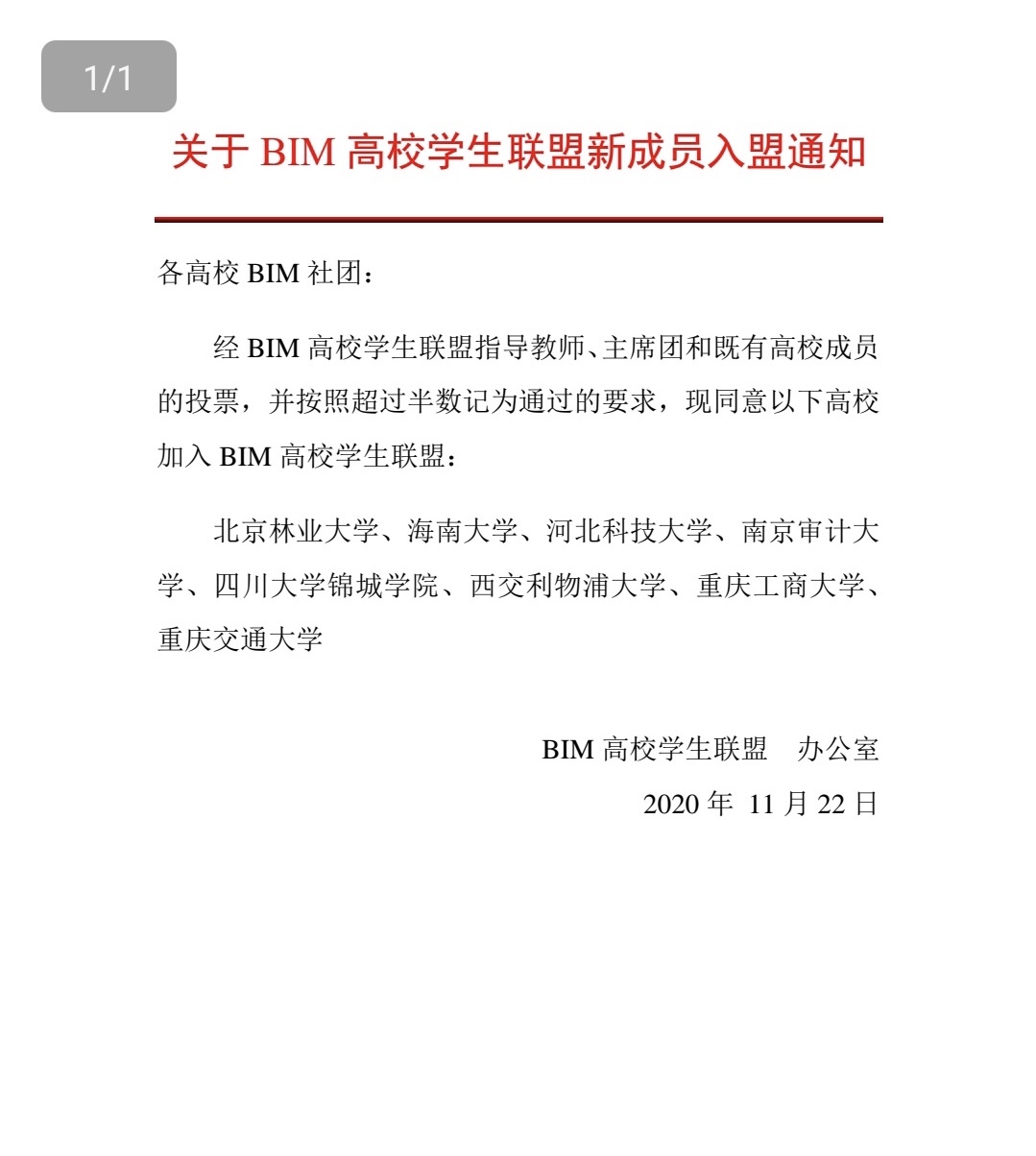 2020年11月22日,我校工程管理专业BIM协会和来自北京林业大学、海南大学、西交利物浦大学、重庆交通大学等八所高校的BIM协会一起,参加了BIM高校学生联盟入盟答辩会议,经评审团投票后,以超半数票通过评审,成功加入BIM高校学生联盟。