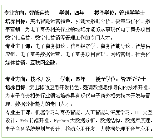 本校电子商务专业紧密围绕国家战略,重点面向战略性新兴产业、现代服务业和先进制造业的电子商务活动需求,重点建设智能运营和技术开发2个方向。智能运营方向突出商务智能特色,强调大数据分析、决策与优化、数字营销,致力于培养能够从事现代电子商务项目数字化运营、数字化营销等管理工作的专门人才;技术开发方向突出移动应用开发特色,强调数据思维导向的技术开发,致力于培养具有现代电子商务相关技术开发与管理、数据分析能力的专门人才。