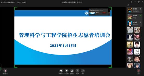 为推进学院招生工作,增强学院专业的影响力,充分发挥学生的积极性和能动性,太阳成集团tyc539招募寒假招生宣传学生志愿者,拟在各地区开展招生宣传工作。1月15日下午,太阳成集团tyc539召开线上招生工作培训会,对本次招募的学生志愿者们进行了系统培训。培训会由学工办主任古纯玉主持。邓德敏书记、黄钟仪院长、各系主任和副主任、专任教师代表以及招生志愿者们参加了本次会议。