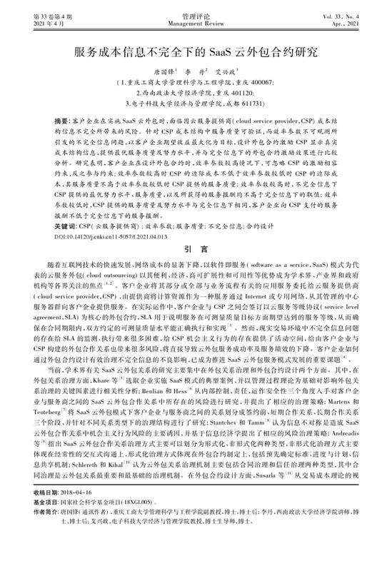 唐国锋,李丹,艾兴政.服务成本信息不完全下的SaaS云外包合约研究[J].管理评论,2021,33(04):160-169.