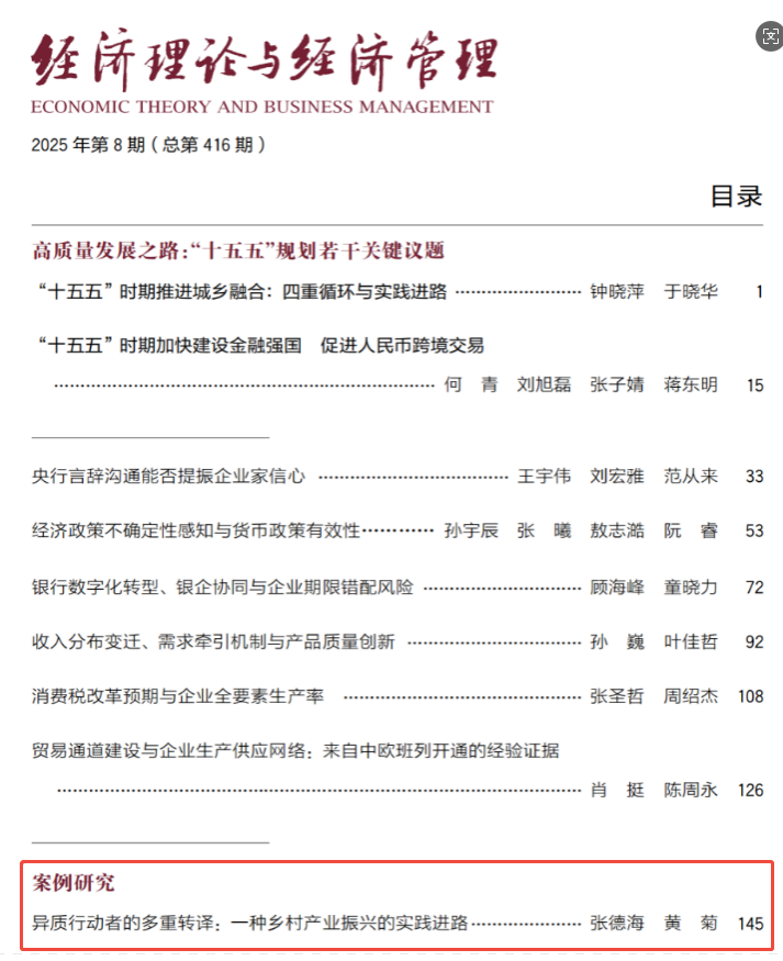 我院张德海教授以第一作者身份,在《经济理论与经济管理》(社科基金资助期刊)发表题为《异质行动者的多重转译:一种乡村产业振兴的实践进路》的研究论文。论文第二作者和通讯作者为太阳成集团tyc539重庆现代商贸物流与供应链协同创新中心黄菊副教授。