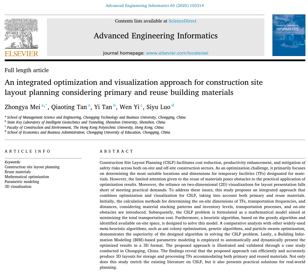 我院梅中亚博士以第一作者和通讯作者身份,在《Advanced Engineering Informatics》(中科院2025年SCI一区TOP期刊)发表题为“An integrated optimization and visualization approach for construction site layout planning considering primary and reuse building materials”的研究论文。