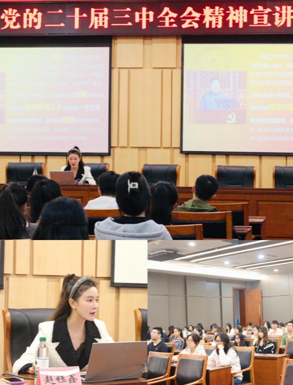 赵钰鑫副书记以“贯彻落实党的二十届三中全会精神,以优良学风助力学生全面发展”为题,紧紧围绕党的二十届三中全会的重大意义、指导思想、重大举措等方面,作了全方位、深层次、多维度的深度宣讲。她强调,要深刻认识进一步全面深化改革的重要性和必要性、重大原则、需要把握的重大问题,切实把思想和行动统一到党中央决策部署上来,广泛凝聚进一步全面深化改革的共识与合力。