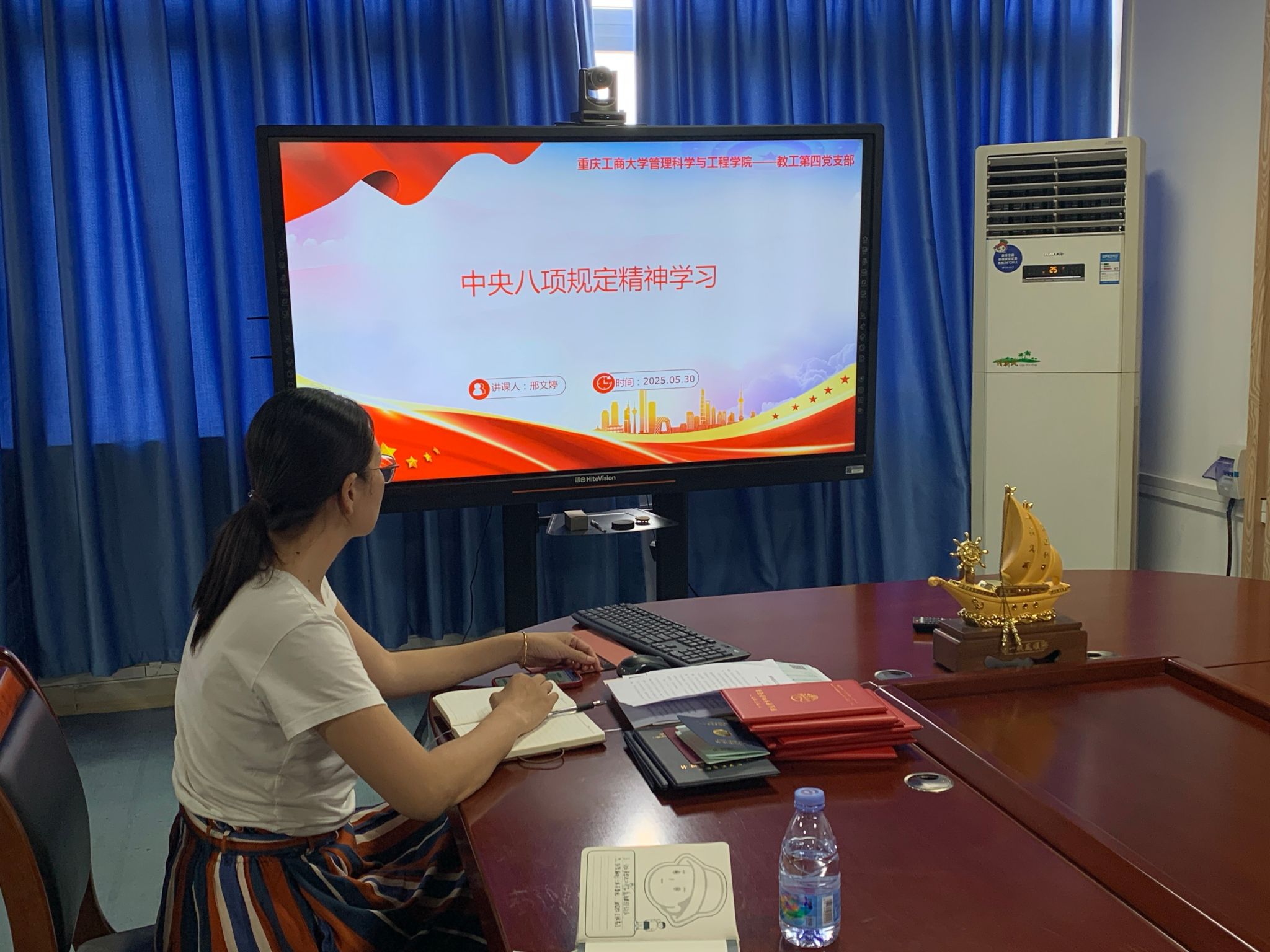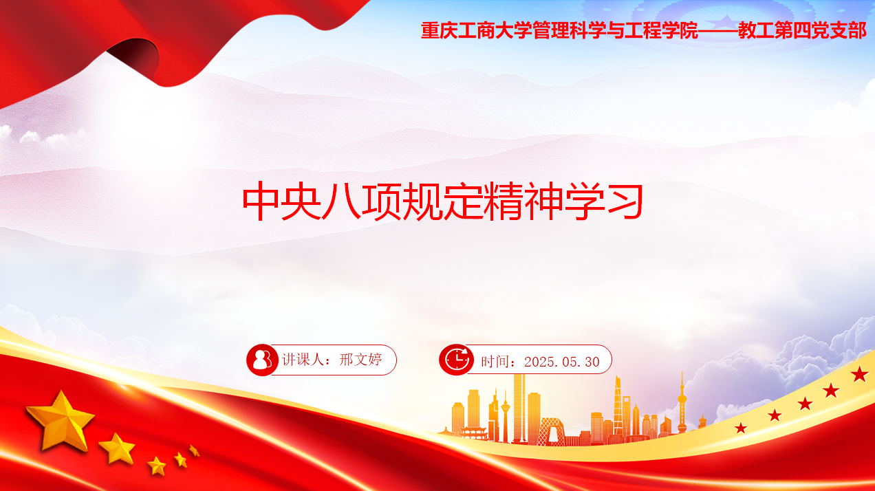 2025年5月30日,教工四支部在启智楼80709会议室召开五月份支部书记讲党课专题学习会,深入学习《中央八项规定精神》,并结合高校教育工作实际,研究贯彻落实举措。会议由党支部书记邢文婷同志主持并主讲,全体党员参加。